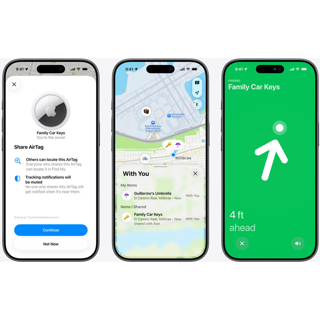 + Deel je AirTag 2 met 5 mensen, bijvoorbeeld voor familie-items zoals een fiets of autosleutels.