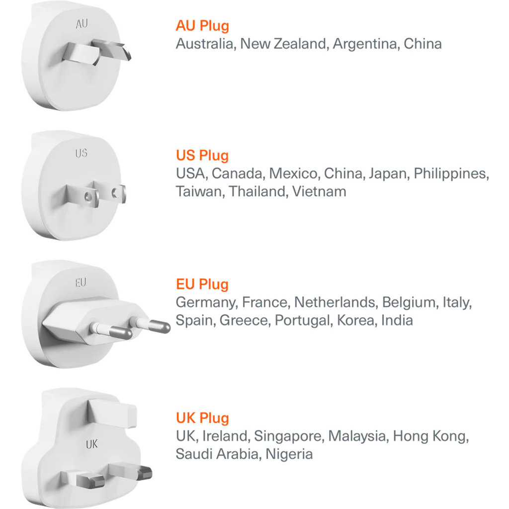 - Inclusief 4 reis adapters (AUS, USA, UK en EU)