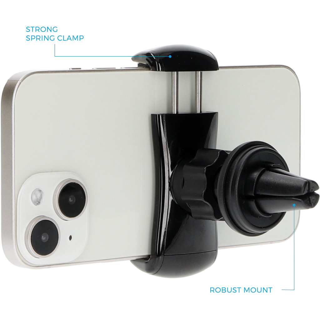 Ontdek de Universele Ventilatierooster Autohouder van Mobiparts jouw reismaatje op de weg! Bevrijd je handen en navigeer veilig of bel handsfree terwijl deze houder moeiteloos in het ventilatierooster van je dashboard blijft zitten. De Vent Holder is stabiel en betrouwbaar, perfect voor jouw rit! Vanwege de stevige klem past bijna elke telefoon in deze houder (tot wel 8cm breed!)