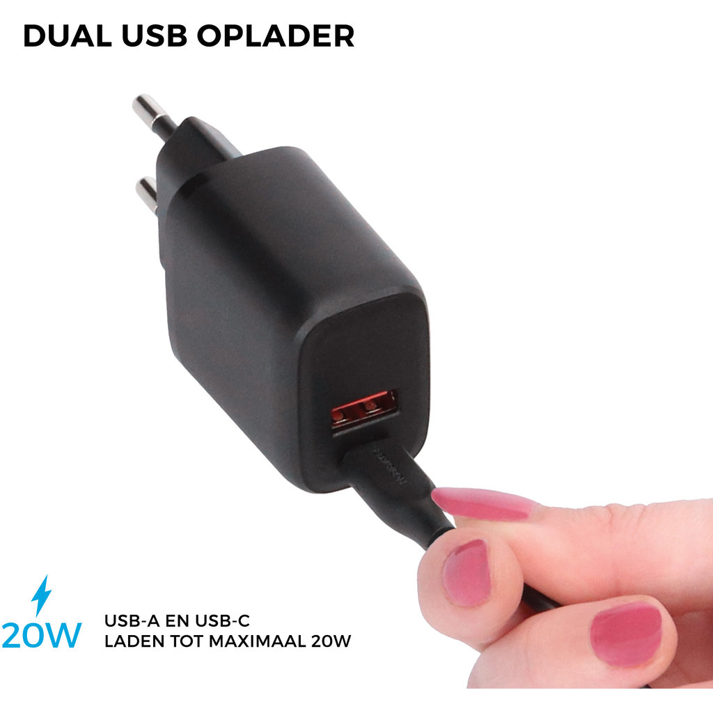 Deze lader biedt de perfecte combinatie van snelheid en veelzijdigheid. Met een vermogen van 20W en dubbele aansluiting (USB-C en USB-A 3.0) is deze lader geschikt voor bijna alle doeleinden. Laad twee apparaten tegelijkertijd op met de snelheid die jouw toestel vraagt.